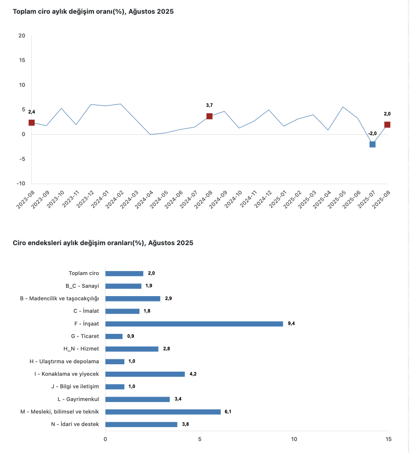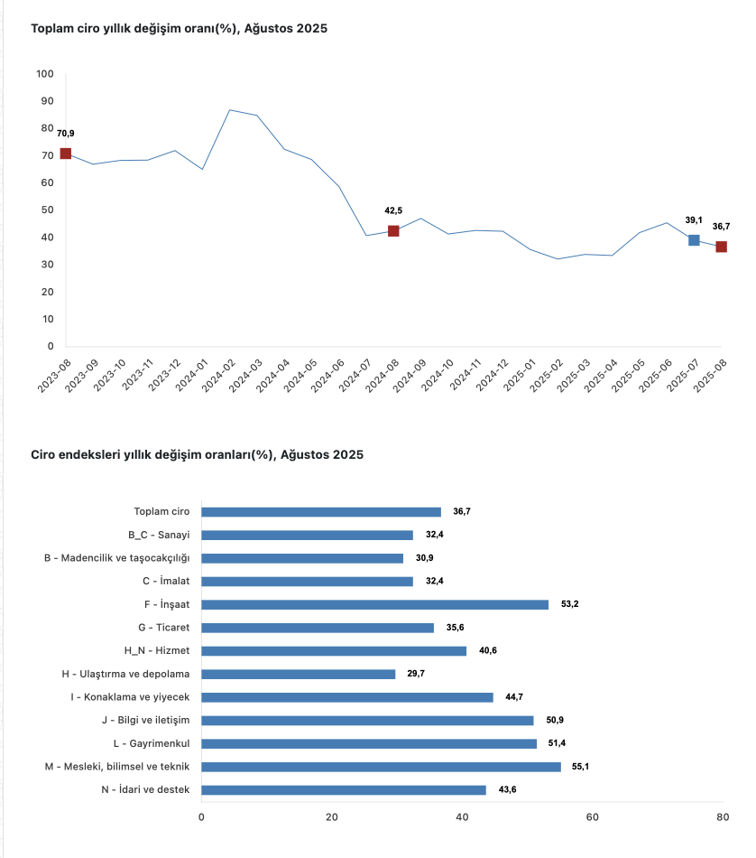 Türkiye İstatisti Kurumu (TÜİK) verilerine göre,toplam cironun alt detaylarına bakıldığında; 2025 yılı Ağustos ayında yıllık sanayi sektörü ciro endeksi yüzde 32,4 arttı, inşaat ciro endeksi yüzde 53,2 arttı, ticaret ciro endeksi yüzde 35,6 arttı, hizmet ciro endeksi yüzde 40,6 arttı.